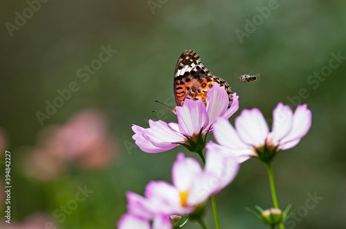 コスモスにとまるヒメアカタテハを攻撃する蜂