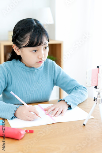 スマートフォンを見ながら勉強する女の子