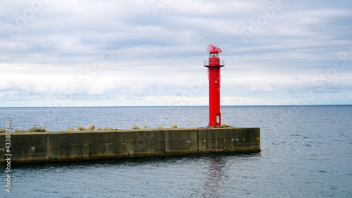 海に突き出た突堤に立つ赤い灯台