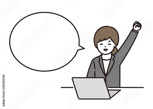 パソコンの前でガッツポーズをするビジネスウーマン 吹き出し