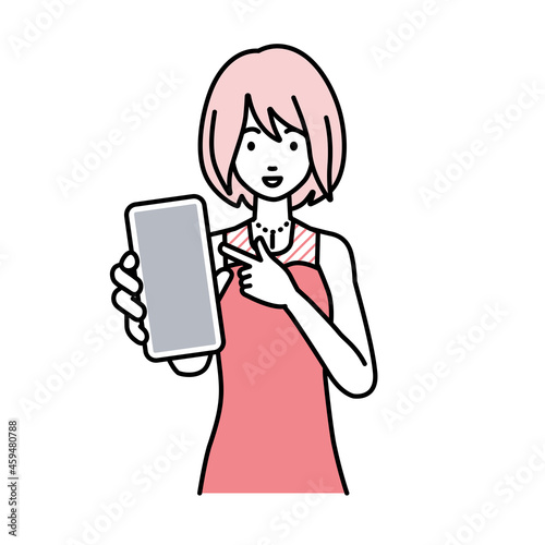 立ってスマートフォンを指差してこちらに向けて見せているドレスの女性