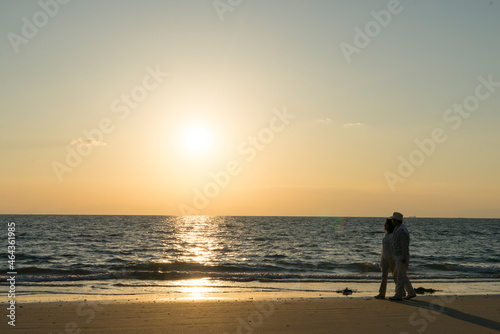 夕日の海岸を散歩する中高年夫婦