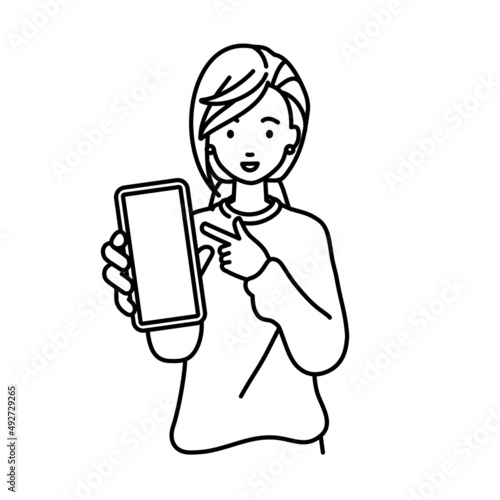 立ってスマートフォンを指差してこちらに向けて見せているリモートワークの女性