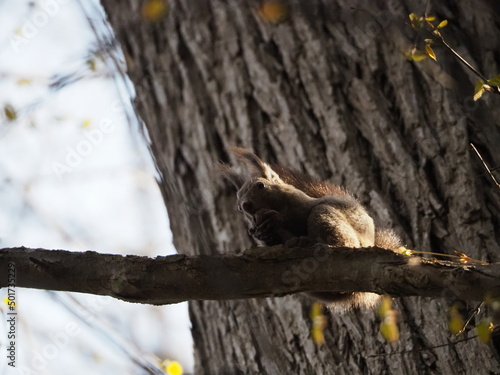 木の枝の上で木の実を食べるエゾリス