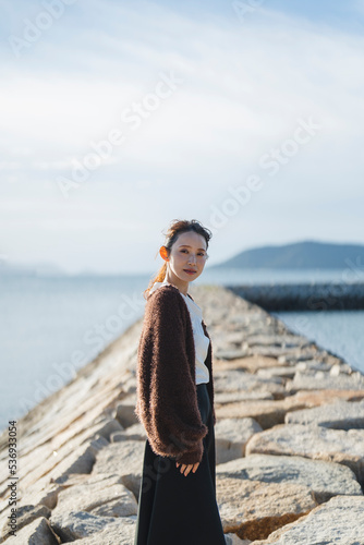 夕暮れの海にいる女性