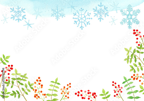 水彩の南天と雪の冬フレーム