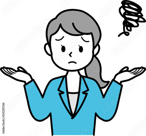 イラスト素材:スーツの女性が困った表情でお手上げ状態を表現する様子 上半身 単色 線画(透過背景)