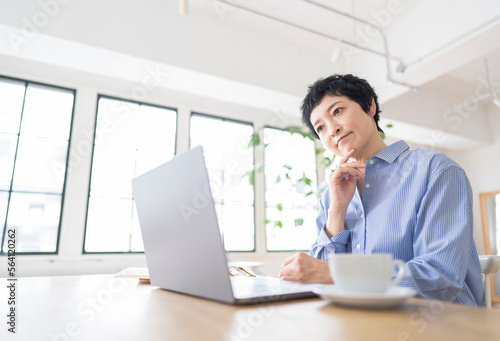 ノートパソコンを使ってテレビ電話で画面越しの相手と話をするアジア人女性、ミドル世代