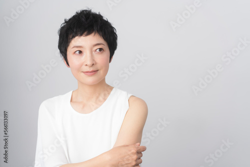 ベリーショートヘアの素肌の美しい日本人女性ビューティーポートレート、ミドル世代
