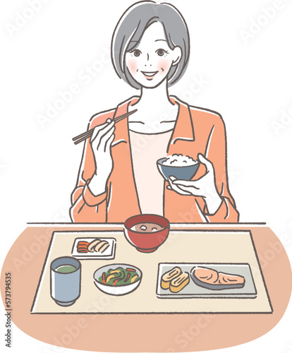 笑顔で食事をするシニア女性