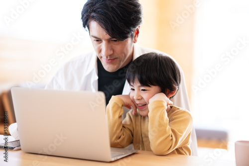 パソコンを見る親子