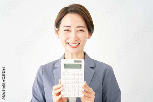 電卓を持つビジネスウーマン 白背景