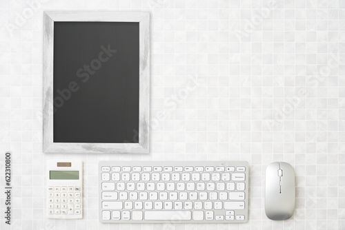 黒板のあるデスクの上の風景 無人 俯瞰撮影