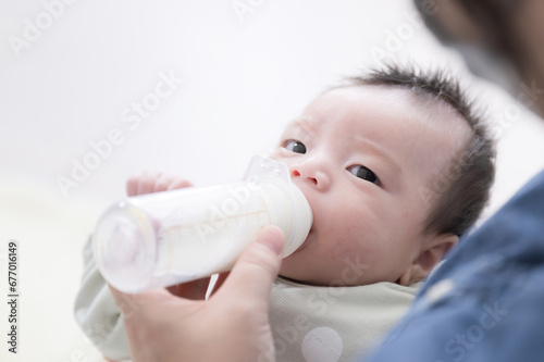哺乳瓶でミルクを飲むベビー服姿の赤ちゃん ママを見ながら仰向けで顔にクローズアップ