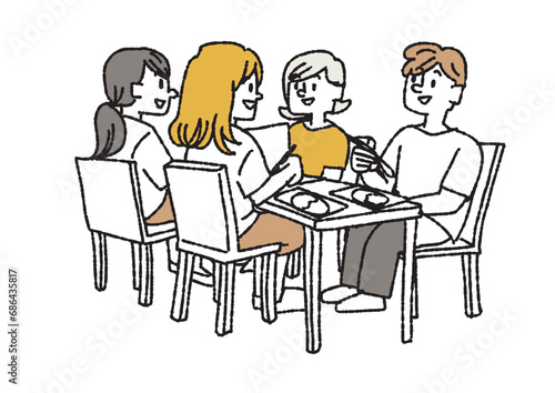 学食で食事をしている学生たちのイラスト コミカルな手書きの人物 ベクター、線画にカラー