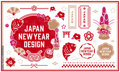 和モチーフのあしらいセット。水引や門松などのイラストやアイコンセット