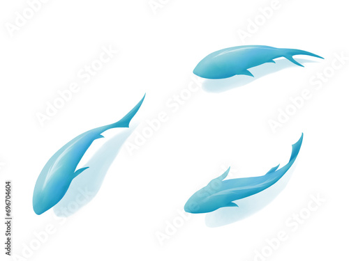上から見た泳ぐ3匹の水色の魚の水彩イラスト(影あり)