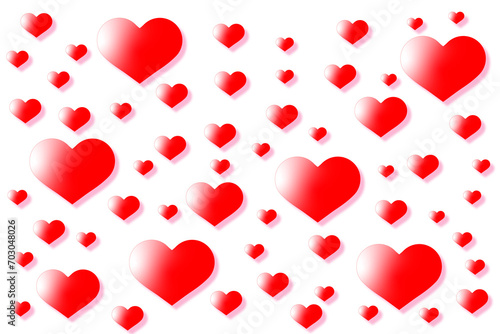 白い背景に大小たくさんのバレンタインの赤いハートのオブジェ