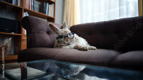 黒縁メガネをかけた灰色のウサギがソファーでくつろいで寝転がっている写真