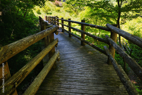 新緑の山江と続いていく木製の橋