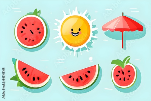 수박,파라솔, 햇님 캐릭터 아이콘