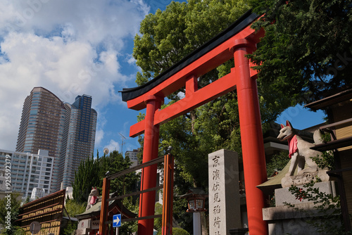 高層マンションと稲荷神社の鳥居