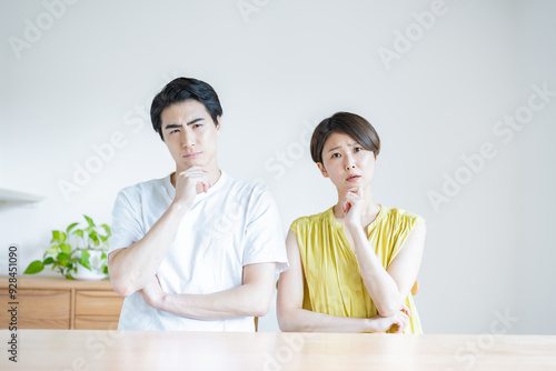 リビングでネガティブに考える日本人カップル