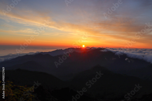 石鎚山頂上からの朝焼けと御来光