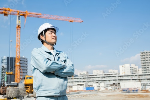 腕組みをして青空を見上げる建設作業員