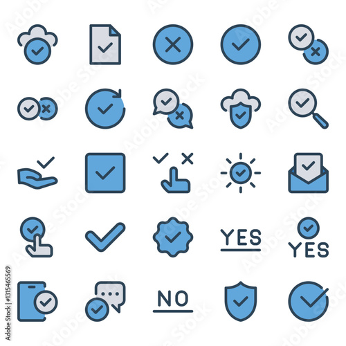 Filled blue outline icons set for Choice accepted, checkmark, validation, check.