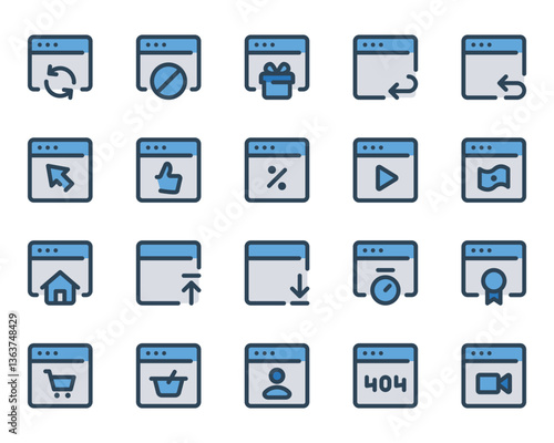 Filled blue outline icons set for Webpages, websites, browser, window.
