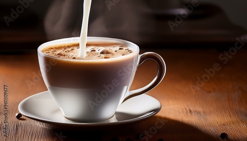 Filling a cup of hot coffee with milk, pouring, delicious drink