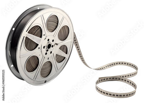 Film reel with classic movie tape unwound on a transparent background
