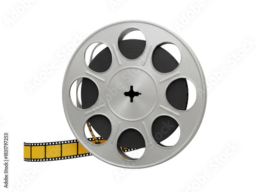 Film reel with yellow film strip PNG isolated on transparent background, vintage movie roll for cinema and entertainment projects