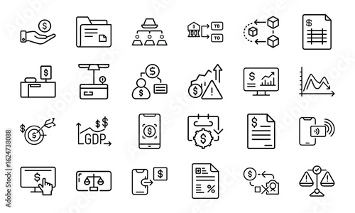 Finance and Banking Line Icons 24 Vector Icons for GDP, Payment Analysis, Transactions, Charts, Mobile Banking and Financial Risk Management UI Design