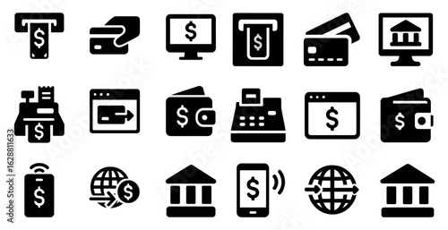 Finance and banking solid icons set – filled, transaction, currency symbols