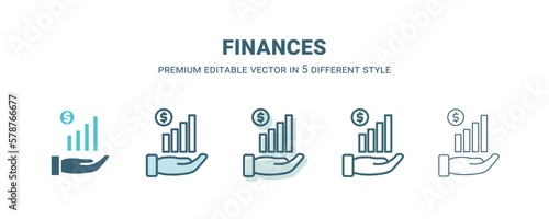 finances icon in 5 different style. Outline, filled, two color, thin finances icon isolated on white background. Editable vector can be used web and mobile