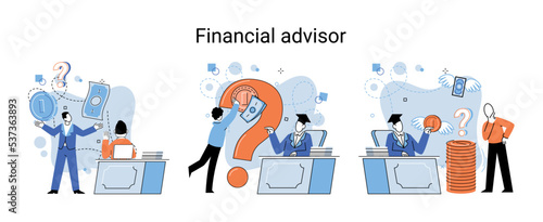 Financial advisor giving advice investment money market analysis management planning for customer. Fiscal consultant professional in finance. Business development successful vested interests metaphor