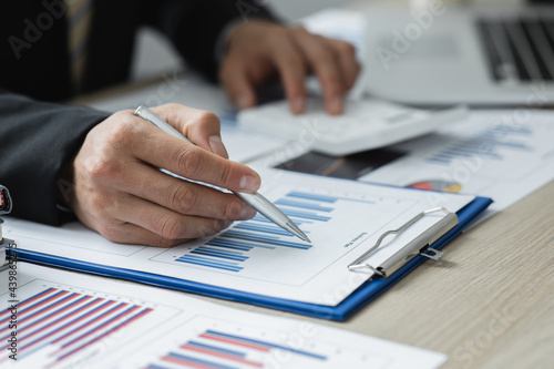 Financial Businessman analyze the graph of the company's performance to create profits and growth, Market research reports and income statistics, Financial and Accounting concept.