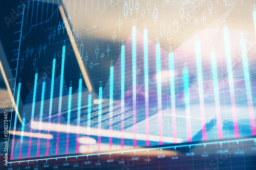 Financial chart drawing and table with computer on background. Double exposure. Concept of international markets.