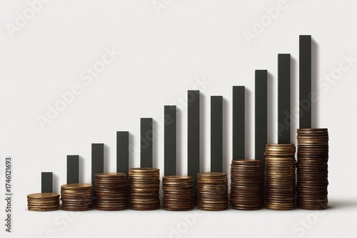 Financial growth concept with increasing coin stacks and a rising bar graph on a white background.