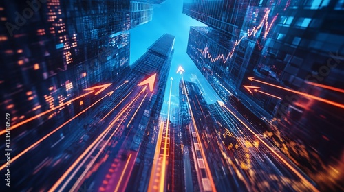Financial Growth Concept with Upward Arrows and Data on City Skyscrapers
