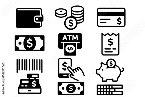 Financial icons set: wallet, atm, money, card, piggy bank, receipt, cash register, payment