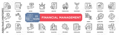 financial management icon collection set. Containing budgeting,accounting,investment,planning,forecasting,analysis,reporting,saving,spending,control and more icon. Simple line vector.