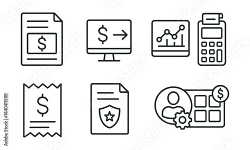Financial management icons set – invoice, transfer, analytics, payment, receipt, security