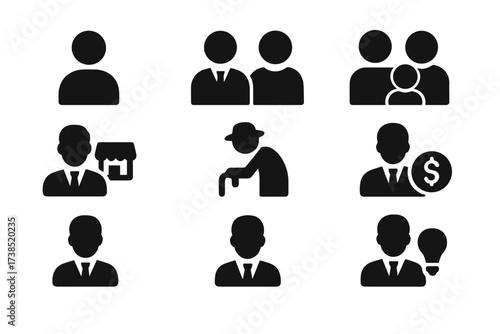 Financial Planner Icons. Solid, filled icon set of financial planner clients: individual, couple, family, business owner, retiree, young
