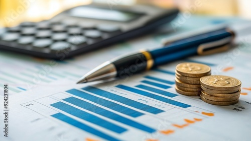 Financial Report with Calculator, Pen and Coins.