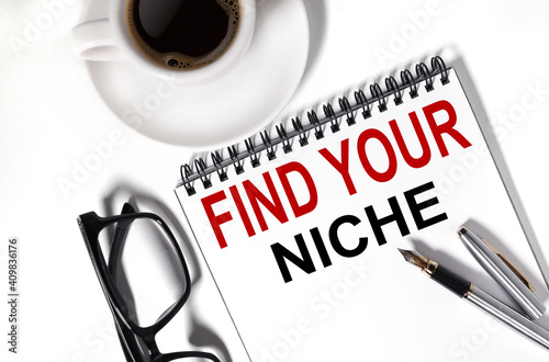 find your niche, text on white notepad paper. notepad lies on white background