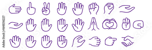 Fingers Actions editable stroke outline web icons set. Fingers, hands, thumb up, ok, point, touch, pray, hand shaking, and like. Vector illustration