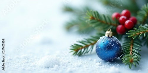 Fir branch with blue pinecones and red berries against a snowy white background, holiday, ball